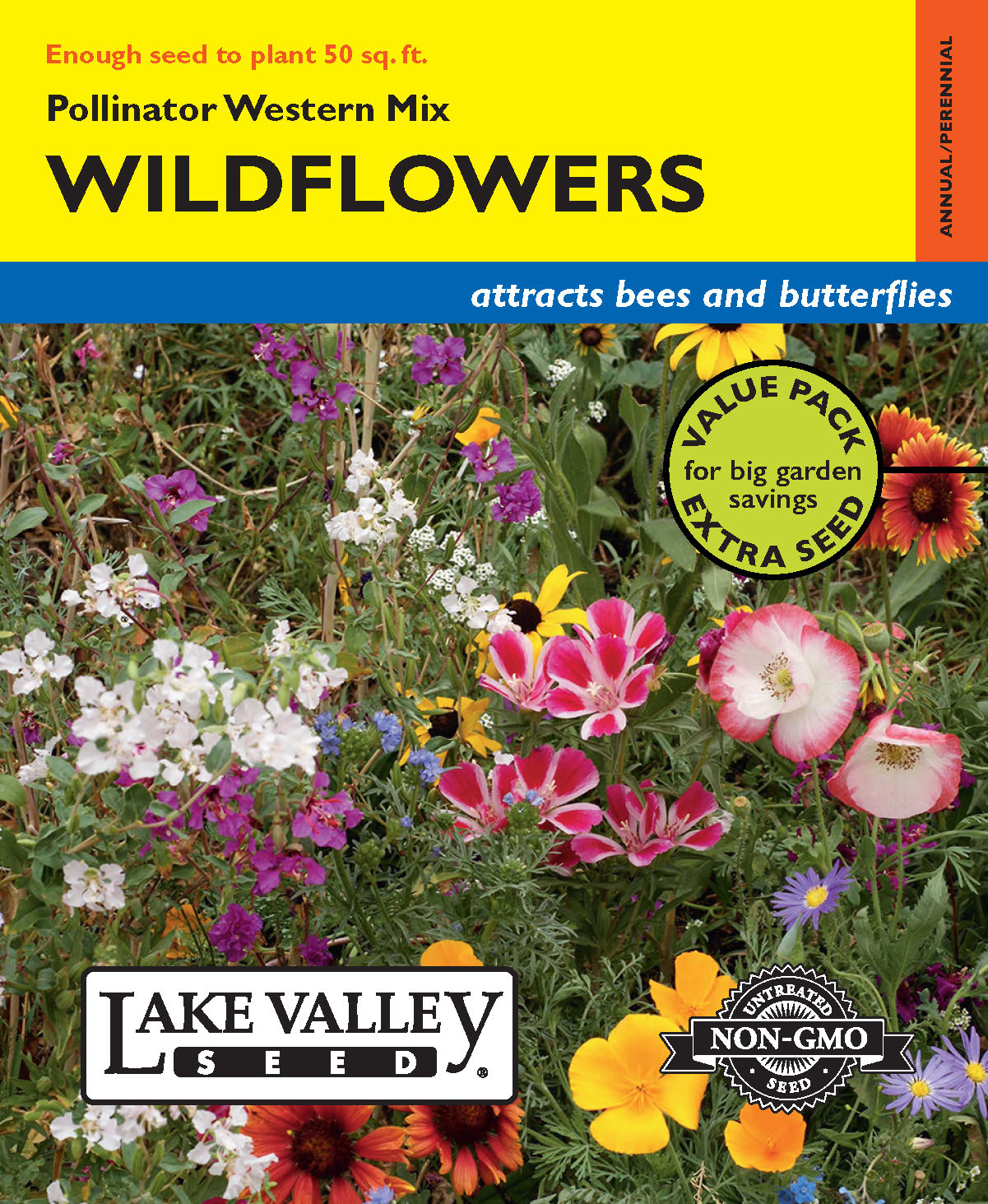 Contains: 13% Baby Blue-Eyes, 10% Rocky Mountain Beeplant, 10% Siberian Wallflower, 7% Blue Flax, 7% CA Orange Poppy, 7% Corn Mixed Poppy, 7% Blanket flower, 7% Rocky Mountain Penstemon, 7% Yellow Lupine, 7% CA Bluebell. Less than 5% each for a total combined mix of 18%: Dotted Gayfeather, Lacy Phacelia, Clarkia, Godetia, Globe Gilia, Utah Sweetvetch, Prairie Coneflower, Fleabane Daisy, Plains Coreopsis, Pale Evening Primrose.